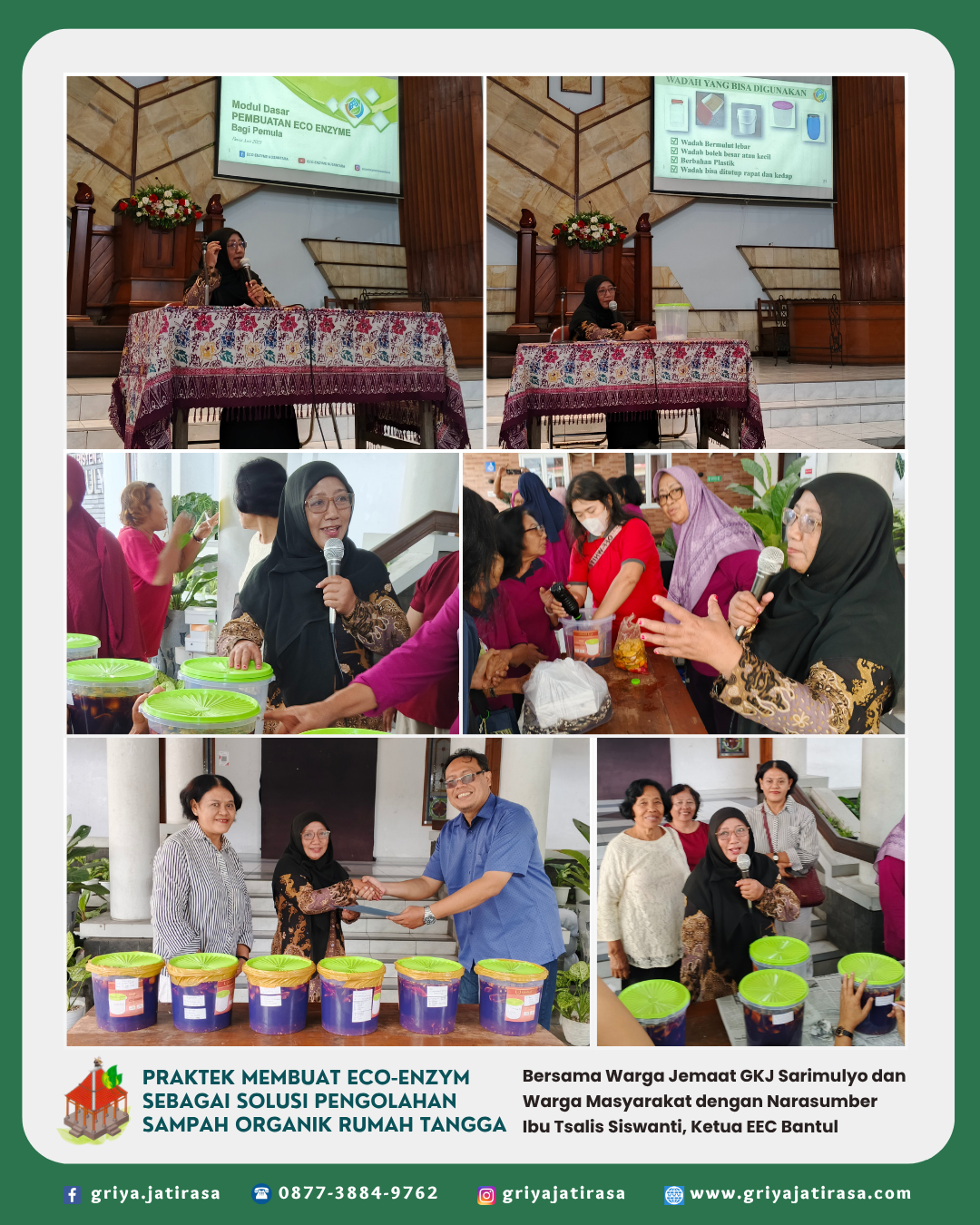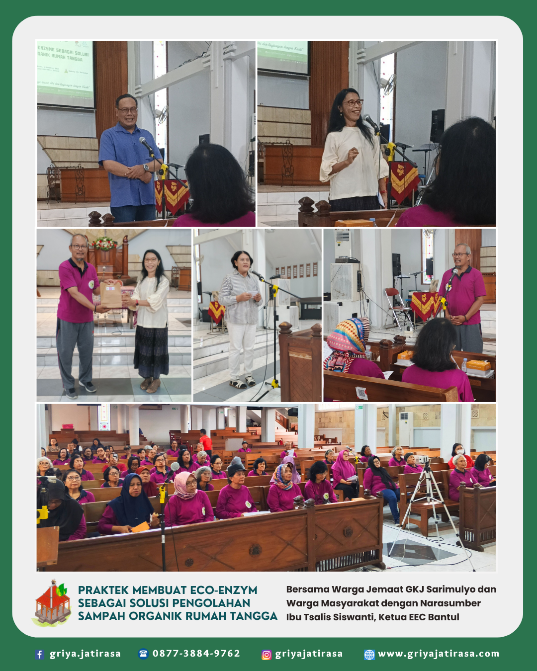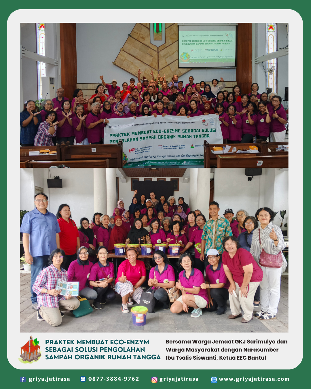 Yayasan Griya Jati Rasa mengawal komitmen Indonesia untuk penurunan emisi karbon sampai 3,8% pada tahun 2030. Dengan berbagai kolaborasi, Yayasan Griya Jati Rasa terus menggalakan berbagai kegiatan langsung dengan masyarakat di DI.Yogyakarta. Hari Kamis, 6 November 2025, jam 08.00 – 10.00 bertempat di Gereja Kristen Jawa (GKJ) Sarimulyo di Jl Raya Kaliurang KM. 5,6 Gang Pandega Bhakti No. 20, Sleman dilakukan pelatihan eco-enzym dengan fasilitator Ibu Tsalis Siswanti yang adalah Ketua Eco Enzyme Nusantara Bantul. Pesertanya yang berjumlah kira-kira 80 orang terdiri dari Warga Jemaat Gereja yaitu Kelompok Adiyuswo, warga Masyarakat Sekitar dan Anggota Koperasi Konsumen Griya Jati Rasa.