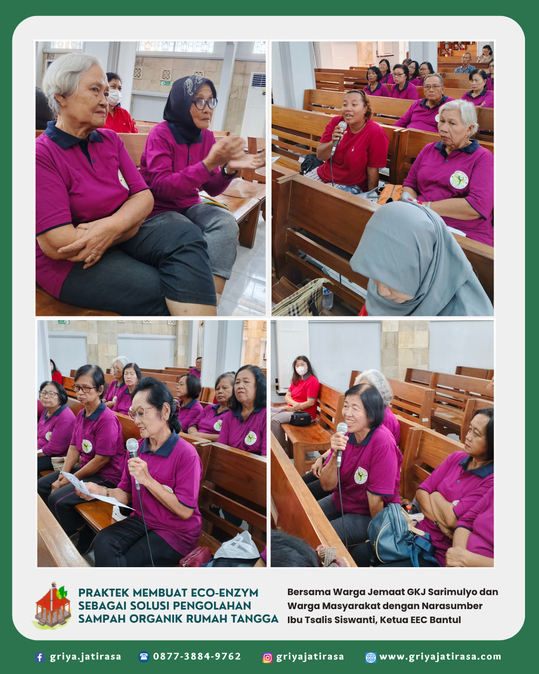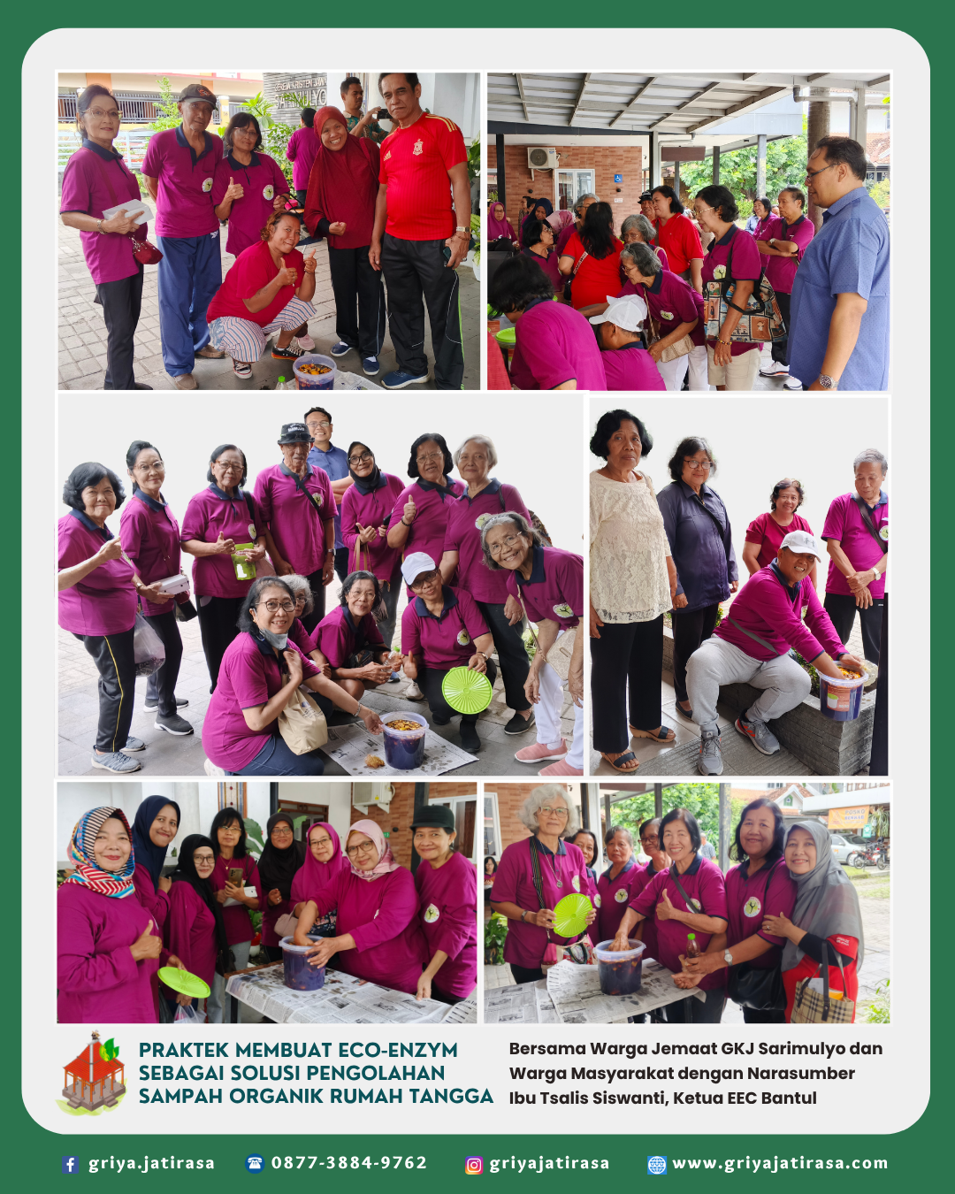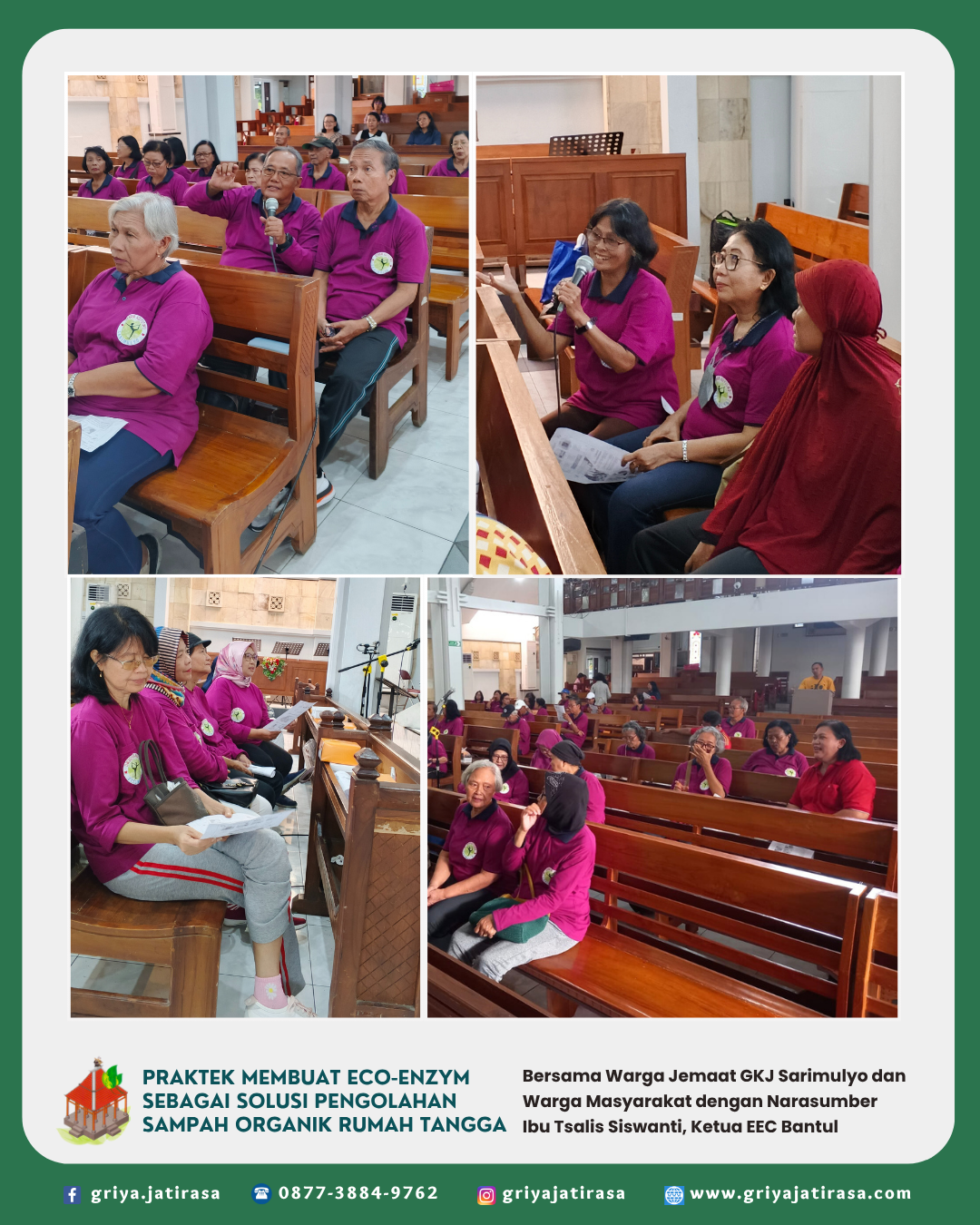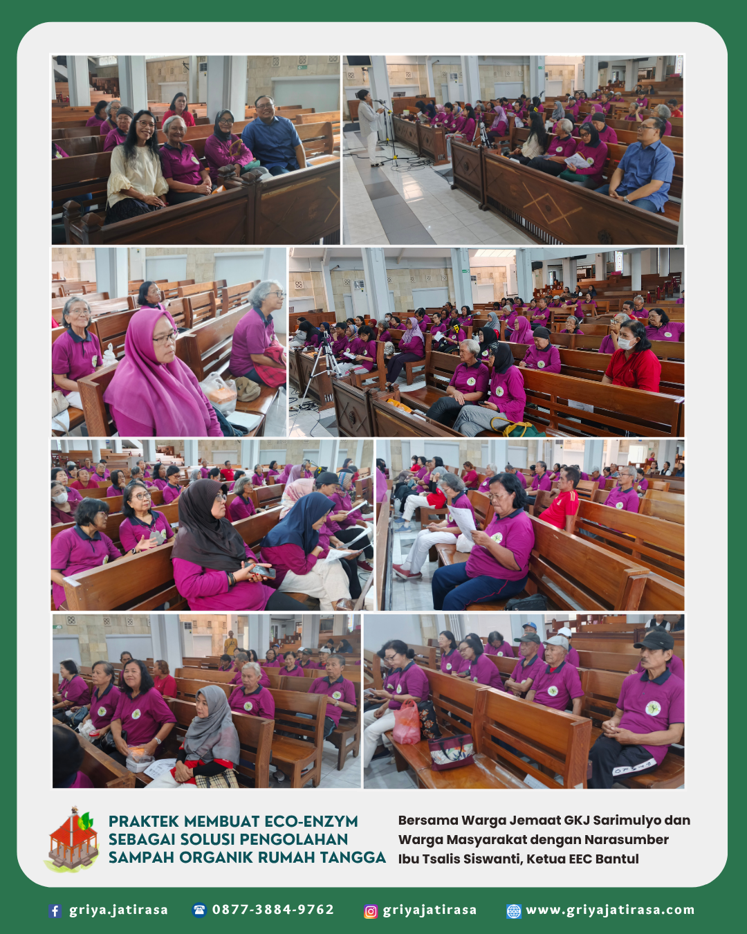 Yayasan Griya Jati Rasa mengawal komitmen Indonesia untuk penurunan emisi karbon sampai 3,8% pada tahun 2030. Dengan berbagai kolaborasi, Yayasan Griya Jati Rasa terus menggalakan berbagai kegiatan langsung dengan masyarakat di DI.Yogyakarta. Hari Kamis, 6 November 2025, jam 08.00 – 10.00 bertempat di Gereja Kristen Jawa (GKJ) Sarimulyo di Jl Raya Kaliurang KM. 5,6 Gang Pandega Bhakti No. 20, Sleman dilakukan pelatihan eco-enzym dengan fasilitator Ibu Tsalis Siswanti yang adalah Ketua Eco Enzyme Nusantara Bantul. Pesertanya yang berjumlah kira-kira 80 orang terdiri dari Warga Jemaat Gereja yaitu Kelompok Adiyuswo, warga Masyarakat Sekitar dan Anggota Koperasi Konsumen Griya Jati Rasa.