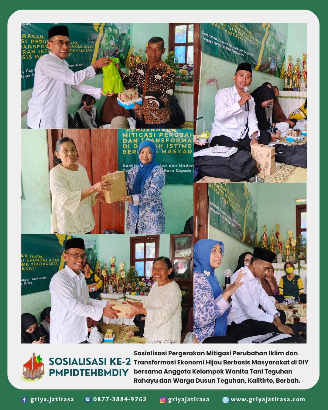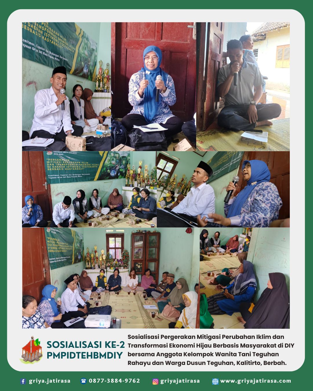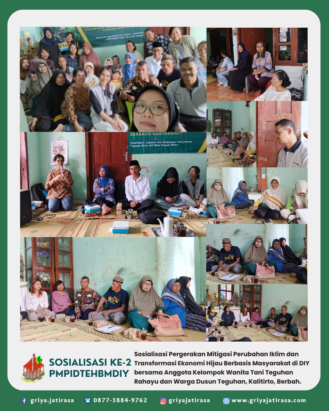 Sosialisasi Pergerakan Mitigasi Perubahan Iklim dan Transformasi Ekonomi Hijau Berbasis Masyarakat di Daerah Istimewa Yogyakarta bersama Anggota Kelompok Wanita Tani (KWT) Teguhan Rahayu dan Warga Masyarakat di Dusun Teguhan, Kalurahan Kalitirto, Berbah, Sleman, D.I. Yogyakarta. Sosialisasi dilaksanakan di rumah Ibu Endarni, anggota Koperasi Konsumen Griya Jati Rasa yang juga adalah Ketua dari KWT Teguhan Rahayu.